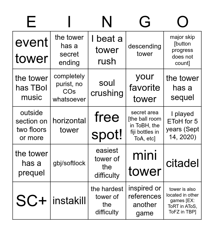 This bingo card has a free space and 24 words: gbj/softlock, instakill, soul crushing, SC+, major skip [button progress does not count], event tower, the tower has TBoI music, the tower has a secret ending, secret area [the ball room in ToBH, the fiji bottles in ToA, etc], easiest tower of the difficulty, your favorite tower, outside section on two floors or more, mini tower, citadel, completely purist, no COs whatsoever, inspired or references another game, I played EToH for 5 years (Sept 14, 2020), I beat a tower rush, the tower has a sequel, horizontal tower, tower is also located in other games [EX: ToRT in AToS, ToFZ in TBP], the tower has a prequel, descending tower and the hardest tower of the difficulty.