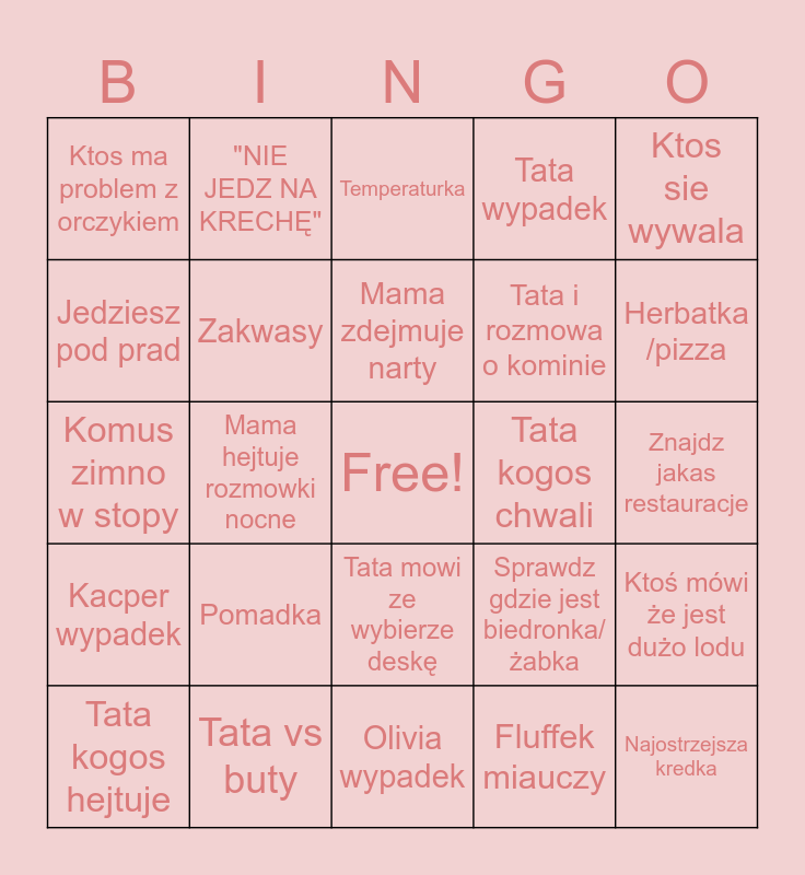 This bingo card has a free space and 24 words: Pomadka, Tata vs buty, Mama zdejmuje narty, Tata kogos hejtuje, Ktos sie wywala, Ktos ma problem z orczykiem, Jedziesz pod prad, "NIE JEDZ NA KRECHĘ", Tata kogos chwali, Tata mowi ze wybierze deskę, Tata i rozmowa o kominie, Komus zimno w stopy, Sprawdz gdzie jest biedronka/żabka, Ktoś mówi że jest dużo lodu, Zakwasy, Fluffek miauczy, Znajdz jakas restauracje, Temperaturka, Herbatka /pizza, Mama hejtuje rozmowki nocne, Najostrzejsza kredka, Kacper wypadek, Tata wypadek and Olivia wypadek.