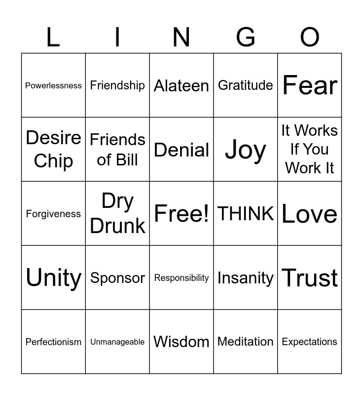 This bingo card has a free space and 75 words: Acceptance, Accountability, Alateen, Amends, Anonymity, Anger, Awareness, Boundaries, Change, Compassion, Controlling, Courage, Denial, Desire Chip, Detachment, Dry Drunk, Enabling, Expectations, Faith, Fear, Feelings, Forgiveness, Friends of Bill, Friendship, Gratitude, Group conscience, HALT, Happiness, Higher Power, Home group, Hope, Honesty, Humility, Insanity, It Works If You Work It, Joy, Letting go, Literature, Love, Meditation, Meetings, Newcomers, Old-timer, Peace, People-pleasing, Perceptions, Perfectionism, Powerlessness, Reacting, Recovery, Resentment, Responsibility, Right Action, Rule 62, Sanity, Self-care, Serenity, Service, Slogans, Spiritual awakening, Sponsor, Step 13, Steps, Surrender, The Promises, THINK, Three Cs, Three Legacies, Traditions, Trust, Unity, Unmanageable, Willingness, Wisdom and Worry.