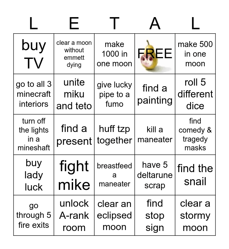 This bingo card has 1 images and 80 words: have 5 fumos, kill an eyeless dog, make 1000 in one moon, pull apperatus, get a shotgun, fight spamton, land on titan, rubber duck, kill a loot bug, go to all 3 darkworlds, kill a butler, fully clear a moon, FREE, buy TV, fight jevil, go to all 3 minecraft interiors, clear a moon without a flashlight, fight mike, tame a heavenly moai, find comedy & tragedy masks, get a shotgun without buying it, make 500 in one moon, turn off the lights in a mineshaft, give lucky pipe to a fumo, unite miku and teto, win a jackpot, find a clown horn, kill a spider, kill a bracken, just monika, roll 5 different dice, clear a foggy moon, clear an eclipsed moon, clear a stormy moon, go through 5 fire exits, kill a maneater, see herobrine, clear easter island, kill something with the cruiser, huff tzp together, visit a bracken room, fly with tulip snakes, buy a jetpack, have 5 different dice, get a beehive, clear a moon without emmett dying, find a mug, celebrate your birthday in a mansion, get gnomed, find robot toy, find the snail, find a present, have 5 deltarune scrap, drink and drive, blow up and die, clear a flooded moon, get a plastic cup, kill a baboon hawk, find a coilhead, breastfeed a maneater, find a painting, fight the watercooler, clear vow, clear adamance, clear ascension, clear offence, find toothpaste, find soccer ball, get foxy jumpscared, find hairdryer, buy lady luck, unlock A-rank room, spraypaint 1225 in a dark world, see an old bird wake up, kill a thumper, scan exactly 1225 credits, find stop sign, find airhorn, have 10 fumos and find a painting.