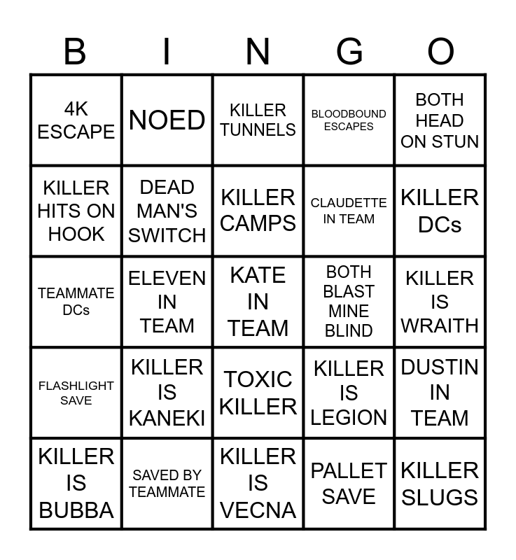 This bingo card has a free space and 24 words: KILLER IS KANEKI, SAVED BY TEAMMATE, KILLER CAMPS, KILLER IS BUBBA, BOTH HEAD ON STUN, 4K ESCAPE, KILLER HITS ON HOOK, NOED, BOTH BLAST MINE BLIND, TOXIC KILLER, CLAUDETTE IN TEAM, TEAMMATE DCs, KILLER IS LEGION, DUSTIN IN TEAM, DEAD MAN'S SWITCH, PALLET SAVE, KILLER IS WRAITH, KILLER TUNNELS, KILLER DCs, ELEVEN IN TEAM, KILLER SLUGS, FLASHLIGHT SAVE, BLOODBOUND ESCAPES and KILLER IS VECNA.