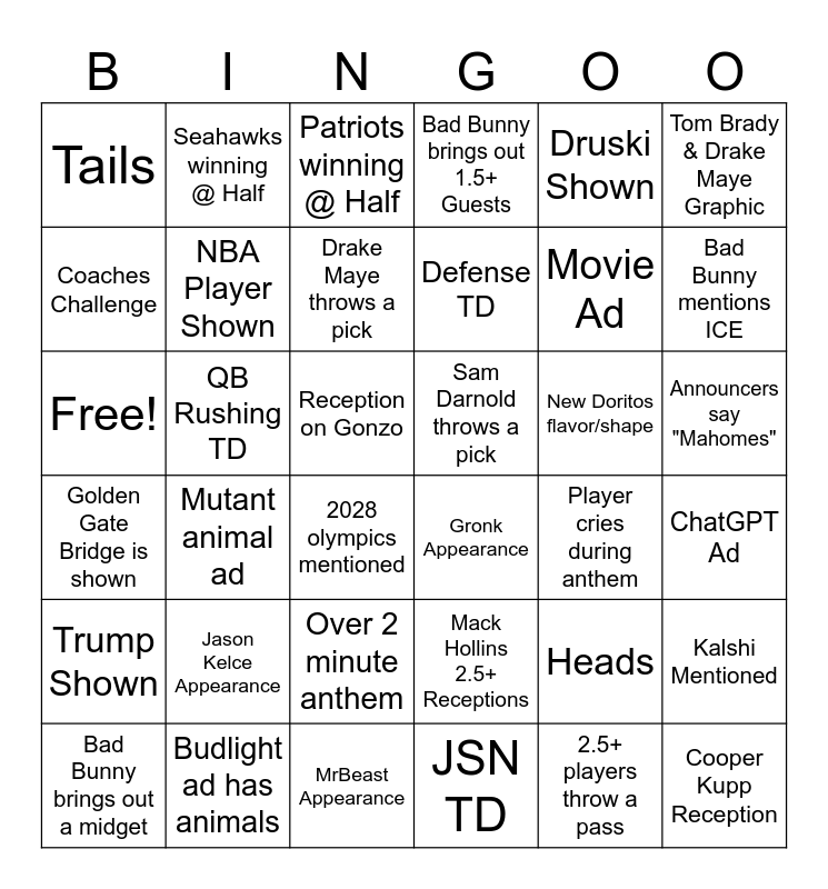 This bingo card has 36 words: Mack Hollins 2.5+ Receptions, Over 2 minute anthem, JSN TD, Coaches Challenge, Golden Gate Bridge is shown, Sam Darnold throws a pick, NBA Player Shown, MrBeast Appearance, Druski Shown, Heads, Bad Bunny mentions ICE, Bad Bunny brings out 1.5+ Guests, Kalshi Mentioned, QB Rushing TD, Defense TD, Tails, Trump Shown, New Doritos flavor/shape, Free!, Patriots winning @ Half, Reception on Gonzo, Mutant animal ad, Gronk Appearance, 2028 olympics mentioned, Player cries during anthem, Seahawks winning @ Half, Movie Ad, Budlight ad has animals, Drake Maye throws a pick, Tom Brady & Drake Maye Graphic, Cooper Kupp Reception, Bad Bunny brings out a midget, ChatGPT Ad, Announcers say "Mahomes", Jason Kelce Appearance and 2.5+ players throw a pass.