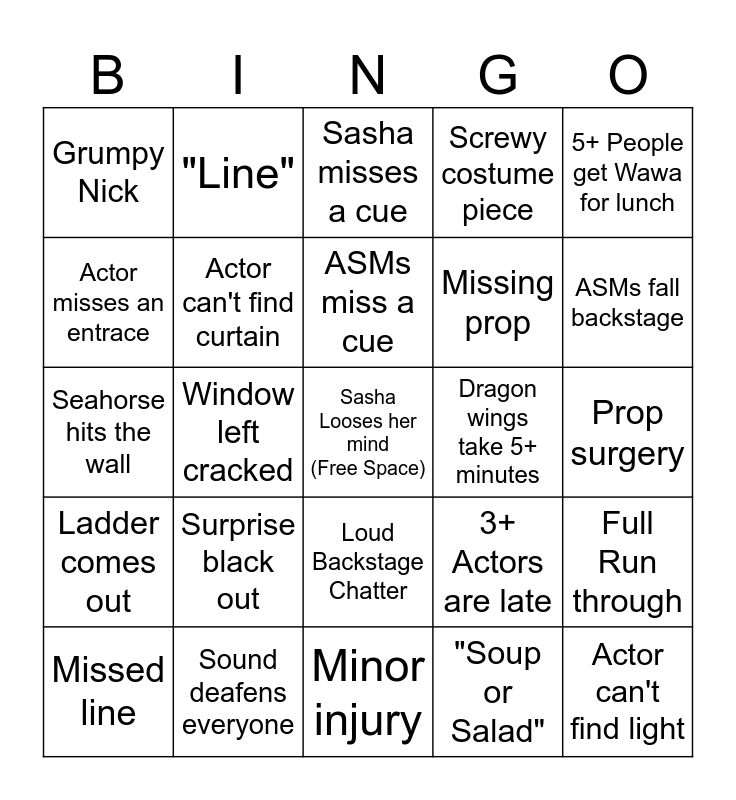 This bingo card has a free space and 24 words: Surprise black out, Sound deafens everyone, ASMs miss a cue, Missed line, 5+ People get Wawa for lunch, Grumpy Nick, Actor misses an entrace, "Line", Dragon wings take 5+ minutes, Loud Backstage Chatter, Missing prop, Seahorse hits the wall, 3+ Actors are late, Full Run through, Actor can't find curtain, "Soup or Salad", Prop surgery, Sasha misses a cue, ASMs fall backstage, Window left cracked, Actor can't find light, Ladder comes out, Screwy costume piece and Minor injury.