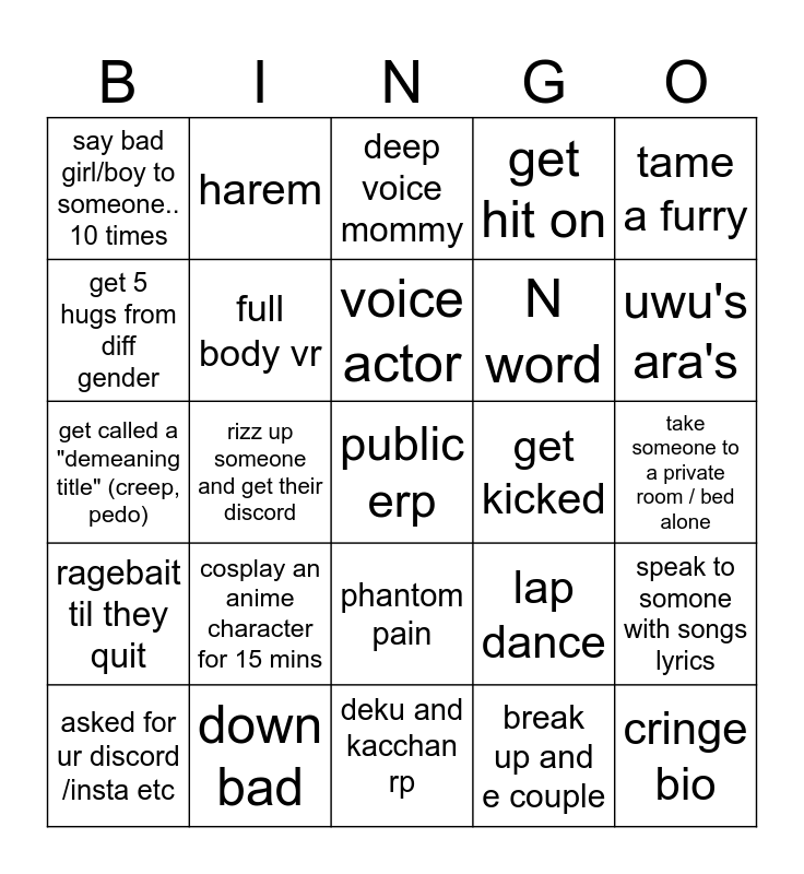 This bingo card has a free space and 24 words: cosplay an anime character for 15 mins, down bad, voice actor, asked for ur discord /insta etc, tame a furry, say bad girl/boy to someone.. 10 times, get 5 hugs from diff gender, harem, get kicked, phantom pain, N word, get called a "demeaning title" (creep, pedo), lap dance, speak to somone with songs lyrics, full body vr, break up and e couple, take someone to a private room / bed alone, deep voice mommy, uwu's ara's, rizz up someone and get their discord, cringe bio, ragebait til they quit, get hit on and deku and kacchan rp.