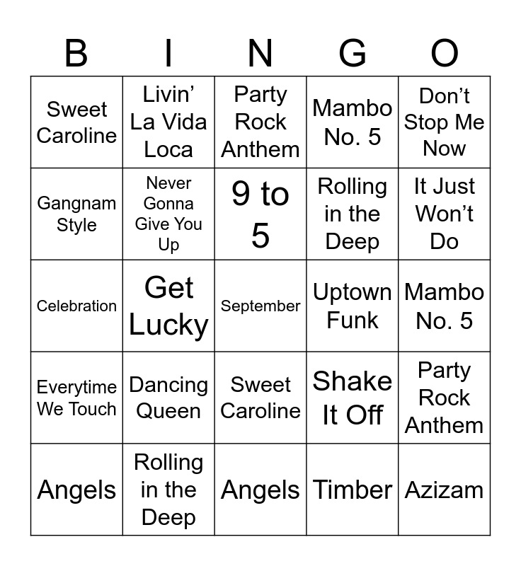 This bingo card has 51 words: Free!, September, I Gotta Feeling, Angels, Dancing Queen, YMCA, Livin’ La Vida Loca, Mr. Brightside, Gangnam Style, Celebration, Never Gonna Give You Up, Mambo No. 5, Party Rock Anthem, Shake It Off, Hey Ya!, Brown Eyed Girl, 9 to 5, Uptown Funk, Bad Romance, Don’t Stop Me Now, Get Lucky, Timber, Sweet Caroline, Rolling in the Deep, Starships, Azizam, It Just Won’t Do, Sweet Child O’ Mine, Angels, Party Rock Anthem, Cake by the Ocean, Get Lucky, Shut Up and Dance, Dancing in the Moonlight, Shake It Off, Rolling in the Deep, Bad Romance, Bonkers, Seven Nation Army, Never Gonna Give You Up, Mambo No. 5, Everytime We Touch, Boogie Wonderland, Brown Eyed Girl, Gangnam Style, Timber, Celebration, Teenage Dirtbag, September, Sweet Caroline and Mr. Brightside.