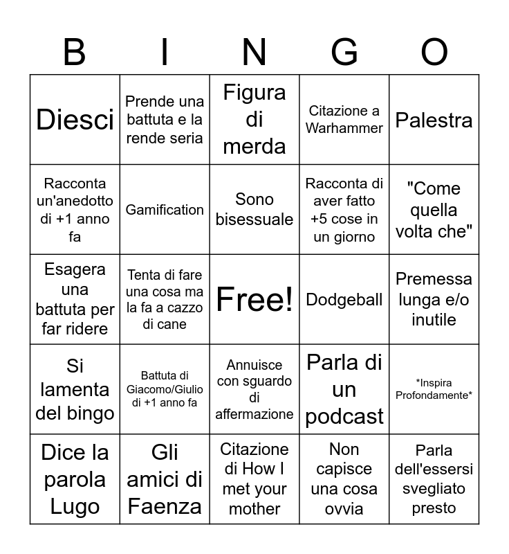 This bingo card has a free space and 25 words: Battuta di Giacomo/Giulio di +1 anno fa, Citazione di How I met your mother, Sono bisessuale, Dice la parola Lugo, Palestra, Diesci, Racconta un'anedotto di +1 anno fa, Prende una battuta e la rende seria, Dodgeball, Annuisce con sguardo di affermazione, Racconta di aver fatto +5 cose in un giorno, Esagera una battuta per far ridere, Parla di un podcast, *Inspira Profondamente*, Gamification, Dice qualcosa su oumy, Premessa lunga e/o inutile, Figura di merda, "Come quella volta che", Tenta di fare una cosa ma la fa a cazzo di cane, Parla dell'essersi svegliato presto, Gli amici di Faenza, Si lamenta del bingo, Citazione a Warhammer and Non capisce una cosa ovvia.