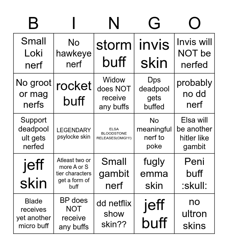 This bingo card has a free space and 24 words: Atleast two or more A or S tier characters get a form of buff, BP does NOT receive any buffs, Widow does NOT receive any buffs, Blade receives yet another micro buff, Invis will NOT be nerfed, Small Loki nerf, No groot or mag nerfs, No hawkeye nerf, No meaningful nerf to poke, Small gambit nerf, Dps deadpool gets buffed, Support deadpool ult gets nerfed, fugly emma skin, Peni buff :skull:, rocket buff, jeff buff, Elsa will be another hitler like gambit, storm buff, probably no dd nerf, LEGENDARY psylocke skin, no ultron skins, jeff skin, invis skin and dd netflix show skin??.