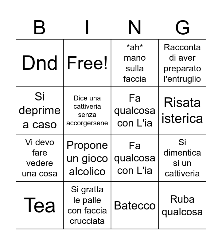 This bingo card has 19 words: Fa qualcosa con L'ia, Troppo più, *ah* mano sulla faccia, Ruba qualcosa, Si dimentica si un cattiveria, Si deprime a caso, Batecco, Dnd, Free!, Vi devo fare vedere una cosa, Propone un gioco alcolico, Dice una cattiveria senza accorgersene, Fa qualcosa con L'ia, Si gratta le palle con faccia crucciata, Tea, Rimini, Racconta di aver preparato l'entruglio, Risata isterica and Fidanzato è solo al matrimonio.