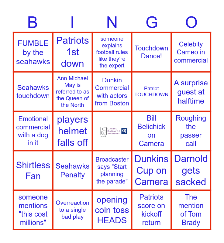 This bingo card has 1 images, a free space and 37 words: Vrabel takes off head set, Pats block a punt, opening coin toss TAILS, Bill Belichick on Camera, Darnold gets sacked, Shirtless Fan, players helmet falls off, "retro" song in commercial: a song from the 70's, 80's or 90's., Patriot TOUCHDOWN, A surprise guest at halftime, Seahawks touchdown, Ann Michael May is referred to as the Queen of the North, Patriots score on kickoff return, Roughing the passer call, FUMBLE by the seahawks, Seahawks Penalty, 2-Point conversion attempt, Touchdown Dance!, False Start Call, Emotional commercial with a dog in it, Patriots 1st down, opening coin toss HEADS, Dunkins Cup on Camera, The mention of Tom Brady, Commercial with a superhero, Broadcaster says "Start planning the parade", Commercial everyone hates immediately, Crowd shot of someone way too emotional, Weather is mentioned, Player yells “LET’S GO”, Dunkin Commercial with actors from Boston, Geico Commercial with the Gecko, Celebity Cameo in commercial, someone mentions "this cost millions", Overreaction to a single bad play, someone explains football rules like they’re the expert and Announcer says “That’s a tough call”.