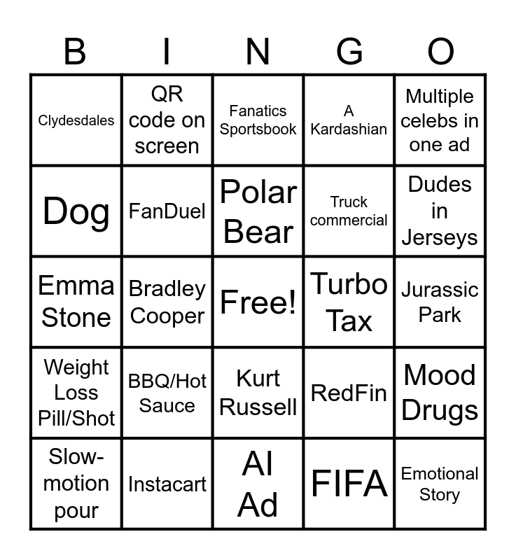 This bingo card has a free space and 31 words: AI Ad, Matthew McConaughey, Bradley Cooper, Bud Light, Clydesdales, Fanatics Sportsbook, FanDuel, RedFin, Turbo Tax, FIFA, Jurassic Park, Emotional Story, Buffalo Wings, Eating Chips, Dudes in Jerseys, TMobile, Mood Drugs, BBQ/Hot Sauce, Weight Loss Pill/Shot, Kurt Russell, Multiple celebs in one ad, Musician in ad, Slow-motion pour, QR code on screen, Truck commercial, Dog, A Kardashian, Emma Stone, Instacart, Polar Bear and Current/Former Football Players.