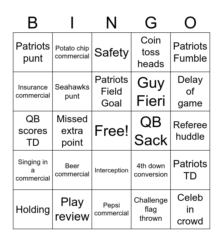 This bingo card has a free space and 37 words: Seahawks extra point, Patriots extra point, Seahawks TD, Seahawks punt, Patriots TD, Beer commercial, Patriots Field Goal, Seahawks Fumble, Patriots Fumble, Budweiser Clydesdales, Missed extra point, Coin toss heads, Celeb in crowd, Referee huddle, Insurance commercial, Singing in a commercial, Missed field goal, Safety, Interception, QB Sack, Patriots punt, Delay of game, Holding, Pepsi commercial, Facemask, Challenge flag thrown, Potato chip commercial, Two point conversion, Dog in a commercial, Candy commercial, Coin toss tails, Play review, QB scores TD, Defense scores TD, 4th down conversion, Guy Fieri and Lady Gaga.