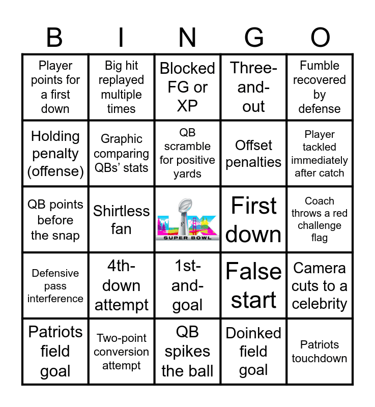 This bingo card has a free space and 43 words: Seahawks touchdown, Patriots touchdown, Seahawks field goal, Patriots field goal, Missed field goal, Doinked field goal, Blocked FG or XP, Pick-6, Fumble recovered by defense, Two-point conversion attempt, Three-and-out, First down, 1st-and-goal, 4th-down attempt, QB gets sacked, QB spikes the ball, QB throws it away, QB points before the snap, Lineman catches a pass, Player tackled immediately after catch, Big hit replayed multiple times, Slow-motion replay, Replay where they circle a player, Player points for a first down, Coach yells at the ref, Coach throws a red challenge flag, Crowd boos a call, Delay of game penalty, False start, Defensive pass interference, Roughing the passer, Camera cuts to a celebrity, Fan wearing face paint, Shirtless fan, “Wait… what’s happening?”, Screen pass, Timeout called to avoid a delay, QB scramble for positive yards, Holding penalty (offense), Offset penalties, Ref says “after further review”, Graphic comparing QBs’ stats and Injury timeout (player walks off).