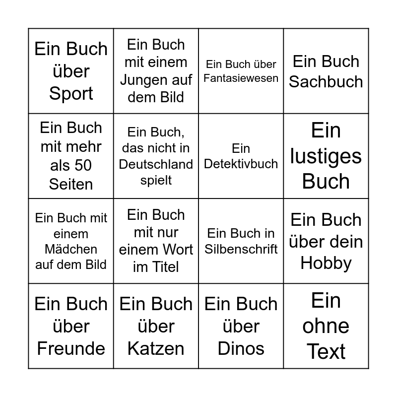 This bingo card has 16 words: Ein Buch über Katzen, Ein Buch über dein Hobby, Ein Buch über Fantasiewesen, Ein Buch über Sport, Ein Buch mit einem Mädchen auf dem Bild, Ein Buch mit einem Jungen auf dem Bild, Ein Buch in Silbenschrift, Ein Buch über Dinos, Ein Buch mit mehr als 50 Seiten, Ein Buch, das nicht in Deutschland spielt, Ein Buch über Freunde, Ein Buch Sachbuch, Ein Buch mit nur einem Wort im Titel, Ein lustiges Buch, Ein Detektivbuch and Ein ohne Text.