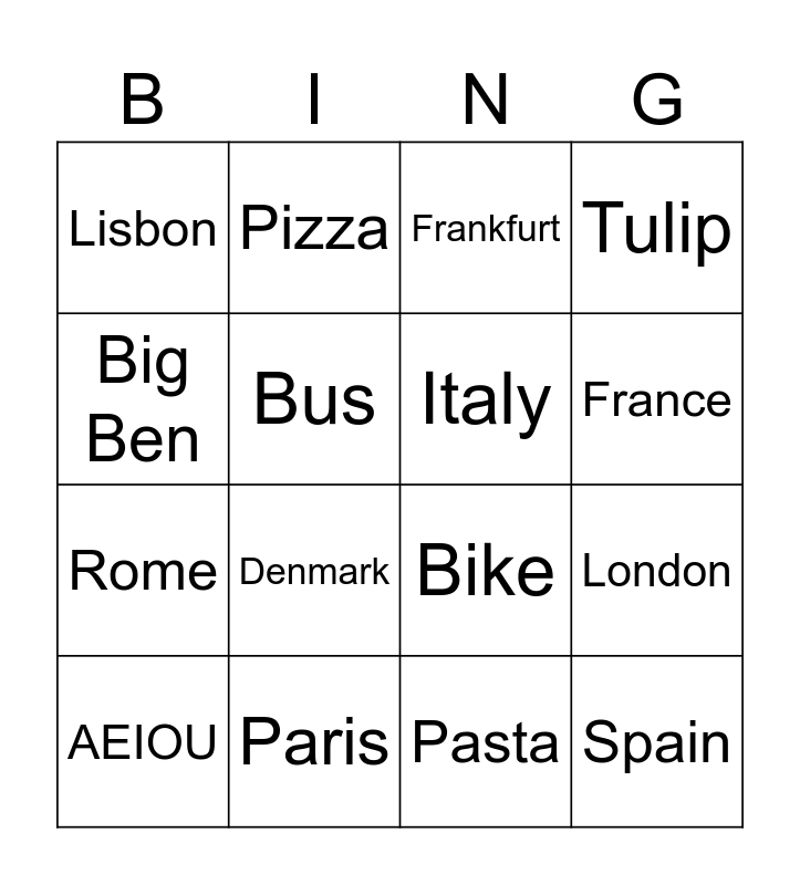 This bingo card has 16 words: Paris, London, Frankfurt, Lisbon, Rome, Pizza, Bike, Pasta, Big Ben, Bus, AEIOU, Tulip, Denmark, France, Italy and Spain.