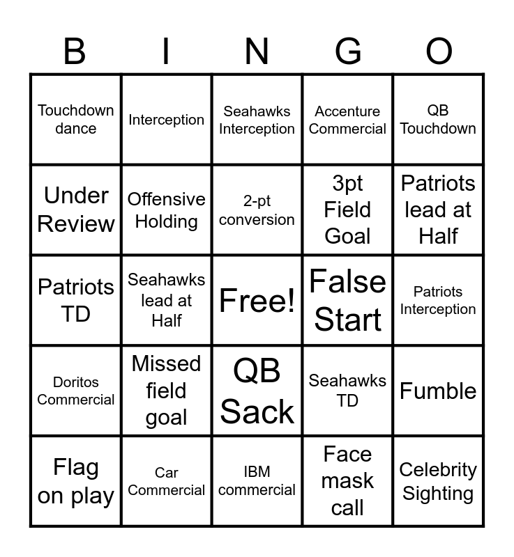 This bingo card has a free space and 25 words: Missed field goal, IBM commercial, 2-pt conversion, Flag on play, QB Touchdown, Touchdown dance, Under Review, Interception, False Start, QB Sack, 3pt Field Goal, Patriots TD, Seahawks TD, Fumble, Offensive Holding, Injury, Patriots Interception, Seahawks Interception, Patriots lead at Half, Seahawks lead at Half, Celebrity Sighting, Car Commercial, Doritos Commercial, Accenture Commercial and Face mask call.
