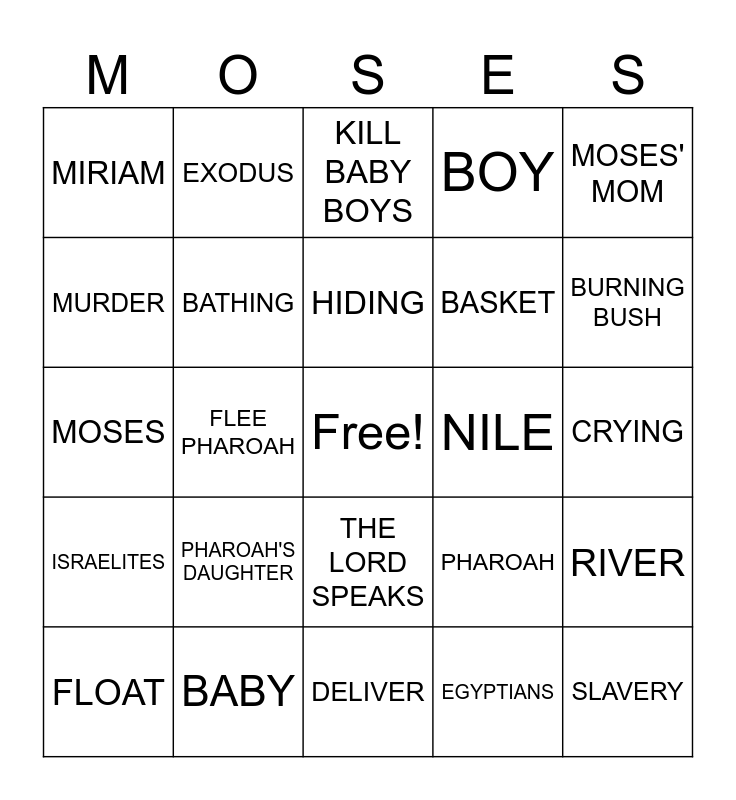 This bingo card has a free space and 24 words: PHAROAH'S DAUGHTER, BABY, HIDING, FLOAT, MOSES' MOM, MIRIAM, MURDER, EXODUS, NILE, THE LORD SPEAKS, BASKET, MOSES, PHAROAH, RIVER, BATHING, EGYPTIANS, CRYING, KILL BABY BOYS, BURNING BUSH, FLEE PHAROAH, SLAVERY, ISRAELITES, BOY and DELIVER.
