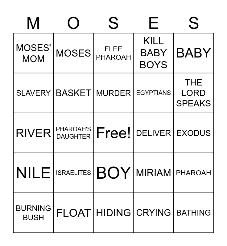 This bingo card has a free space and 24 words: ISRAELITES, FLOAT, MURDER, BURNING BUSH, BABY, MOSES' MOM, SLAVERY, MOSES, DELIVER, BOY, EGYPTIANS, RIVER, MIRIAM, PHAROAH, BASKET, CRYING, EXODUS, FLEE PHAROAH, THE LORD SPEAKS, PHAROAH'S DAUGHTER, BATHING, NILE, KILL BABY BOYS and HIDING.