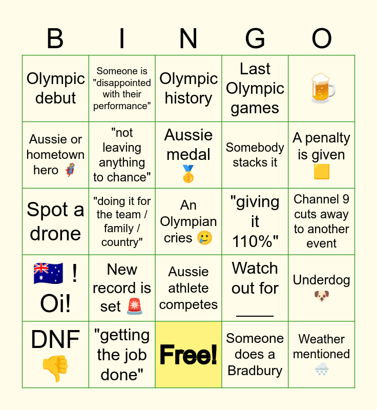 This bingo card has 25 words: 🇦🇺 ! Oi!, "getting the job done", An Olympian cries 🥲, Someone does a Bradbury, 🍺, Olympic debut, Someone is "disappointed with their performance", Olympic history, "giving it 110%", Underdog 🐶, Aussie or hometown hero 🦸, "not leaving anything to chance", Free!, Watch out for ____, A penalty is given 🟨, DNF👎, "doing it for the team / family / country", Aussie medal 🥇, Somebody stacks it, Channel 9 cuts away to another event, Spot a drone, New record is set 🚨, Aussie athlete competes, Last Olympic games and Weather mentioned 🌨️.