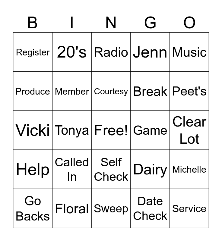 This bingo card has a free space and 24 words: Called In, Floral, Courtesy, Go Backs, Music, Register, Produce, 20's, Game, Self Check, Break, Vicki, Dairy, Michelle, Member, Date Check, Clear Lot, Radio, Peet's, Tonya, Service, Help, Jenn and Sweep.