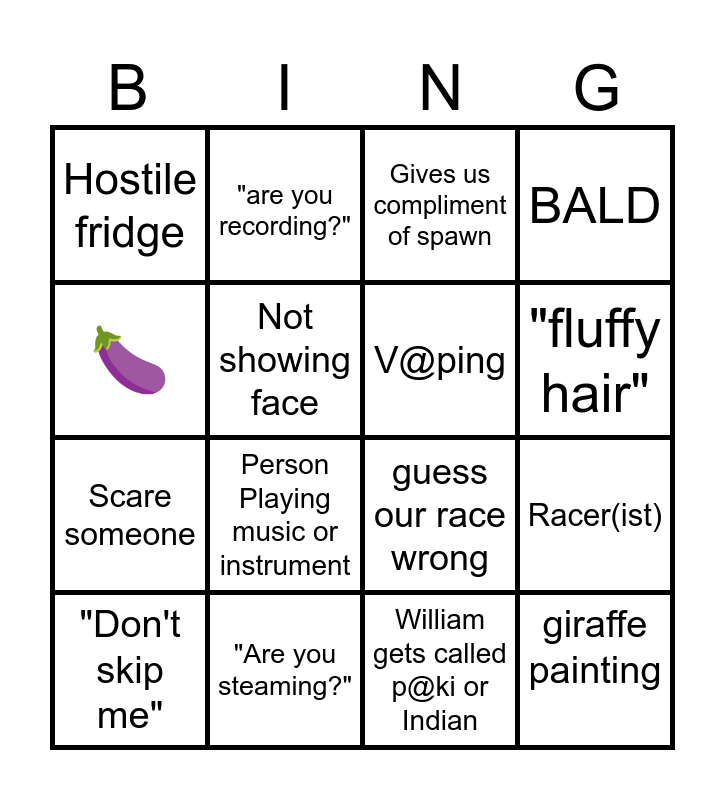 This bingo card has 16 words: "Are you steaming?", Racer(ist), Gives us compliment of spawn, Hostile fridge, Scare someone, "are you recording?", guess our race wrong, William gets called p@ki or Indian, 🍆, Not showing face, "Don't skip me", BALD, Person Playing music or instrument, "fluffy hair", V@ping and giraffe painting.