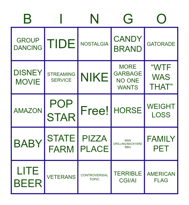 This bingo card has a free space and 35 words: LUXURY CAR BRAND, COCA-COLA, TAX SOFTWARE, STREAMING SERVICE, PIZZA PLACE, CANDY BRAND, DISNEY MOVIE, MARVEL MOVIE, NIKE, DORITOS, AMAZON, GATORADE, TALKING ANIMAL, SUPERMODEL, GROUP DANCING, HORSE, TERRIBLE CGI/AI, POP STAR, BABY, AMERICAN FLAG, MAN GRILLING/BACKYARD BBQ, LITE BEER, FAMILY PET, VETERANS, NOSTALGIA, “WTF WAS THAT”, UBER EATS, SOMETHING YOU’VE NEVER HEARD OF, MORE GARBAGE NO ONE WANTS, WEIGHT LOSS, ANNOUNCEMENT OF SOME SORT, CONTROVERSIAL TOPIC, STATE FARM, TIDE and AI HUMANS.