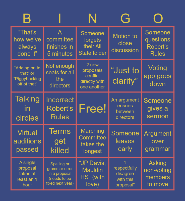 This bingo card has a free space and 31 words: “JP Davis, Mauldin HS” (with love), An amendment gets amended, Incorrect Robert’s Rules, Someone around you complains about meeting length, “That’s how we’ve always done it”, Someone forgets their All State folder, Not enough seats for all the directors, Someone leaves early, An argument ensues between directors, “I respectfully disagree with this proposal”, Someone gives a sermon, Asking non-voting members to move, Master Recital distraction next door, Someone laughs at a proposal, Voting app goes down, All State Committee takes the longest, Argument over grammar, Terms get killed, Virtual auditions passed, Marching Committee takes the longest, Someone questions Robert’s Rules, Someone takes their anger out on a committee chair, A single proposal takes at least an 1 hour, A committee finishes in 5 minutes, “Just to clarify”, “Adding on to that” or “Piggybacking off of that”, Motion to close discussion, Talking in circles, Spelling or grammar error in a proposal (needs to be fixed next year), 2 new proposals conflict directly with one another and Projector / Powerpoint issues.