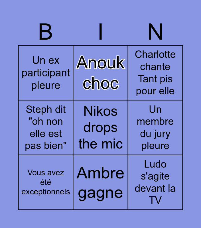 This bingo card has a free space and 8 words: Un membre du jury pleure, Charlotte chante Tant pis pour elle, Anouk choc, Vous avez été exceptionnels, Un ex participant pleure, Ludo s'agite devant la TV, Steph dit "oh non elle est pas bien" and Ambre gagne.