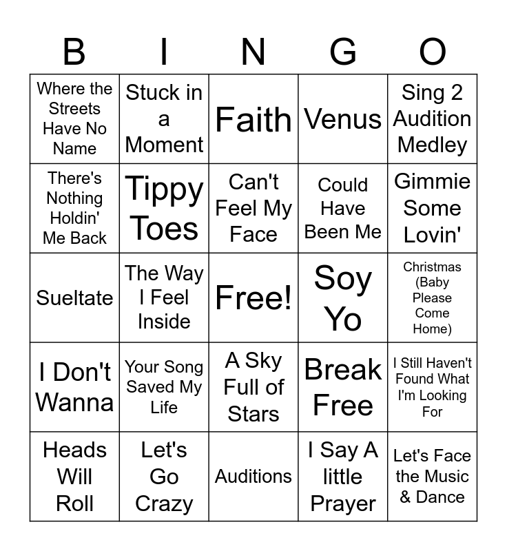 This bingo card has a free space and 24 words: Your Song Saved My Life, Let's Go Crazy, Can't Feel My Face, Heads Will Roll, Sing 2 Audition Medley, Where the Streets Have No Name, There's Nothing Holdin' Me Back, Stuck in a Moment, Soy Yo, A Sky Full of Stars, Could Have Been Me, Sueltate, Break Free, I Still Haven't Found What I'm Looking For, Tippy Toes, I Say A little Prayer, Christmas (Baby Please Come Home), Faith, Gimmie Some Lovin', The Way I Feel Inside, Let's Face the Music & Dance, I Don't Wanna, Venus and Auditions.