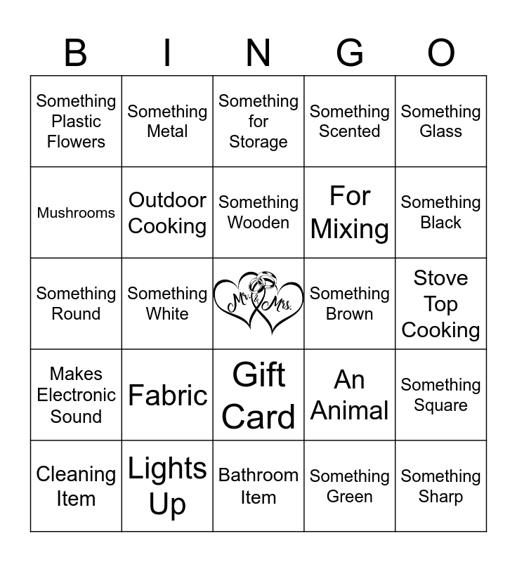 This bingo card has a free space and 25 words: Fabric, Bathroom Item, Something Wooden, Cleaning Item, Something Glass, Something Plastic Flowers, Mushrooms, Something Metal, Something Brown, Gift Card, For Mixing, Something Round, An Animal, Something Square, Outdoor Cooking, For Baking, Stove Top Cooking, Something for Storage, Something Black, Something White, Something Sharp, Lights Up, Makes Electronic Sound, Something Scented and Something Green.
