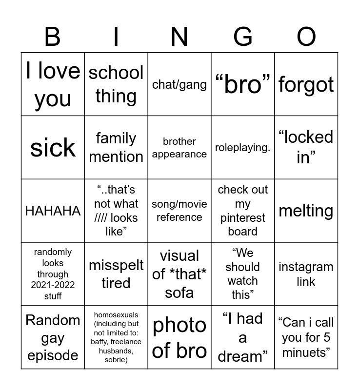 This bingo card has a free space and 24 words: Random gay episode, misspelt tired, brother appearance, “I had a dream”, forgot, I love you, school thing, chat/gang, check out my pinterest board, melting, HAHAHA, family mention, “We should watch this”, instagram link, sick, homosexuals (including but not limited to: baffy, freelance husbands, sobrie), photo of bro, “bro”, “locked in”, randomly looks through 2021-2022 stuff, “..that’s not what //// looks like”, visual of *that* sofa, roleplaying. and “Can i call you for 5 minuets”.