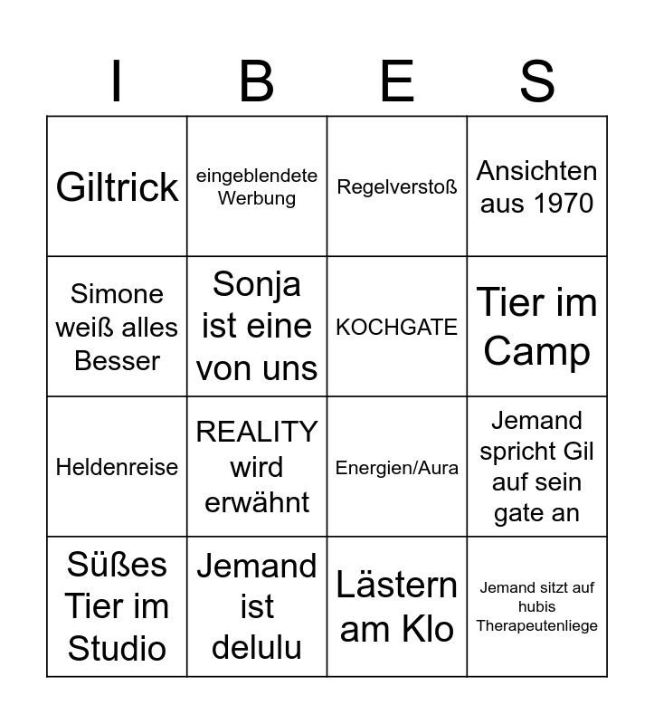 This bingo card has 32 words: Free!, DIE MASKEN FALLEN, Jemand spricht Gil auf sein gate an, Ariel rastet vorm auszug nochmal aus, Jemand sitzt auf hubis Therapeutenliege, KOCHGATE, Simone weiß alles Besser, Simone mausert ich, eingeblendete Werbung, Takkobluse, Tier im Camp, Regelverstoß, Haare flechten, PEINLEECH, Jemand ist delulu, Bezugsperson, Hubi schnarcht, Energien/Aura, Prüfung wird nicht verstanden, Sonja und Jan müssen sich das lachen verkneifen, Eva gräbt an Patrick rum, rtl hat guten schnitt (außer vorspann), Lästern am Klo, Lästern am Feuer, Süßes Tier im Studio, Ansichten aus 1970, Heldenreise, Sonja ist eine von uns, Giltrick, Samira ist queen, Jemand erwähnt die Krone/Sieg and REALITY wird erwähnt.
