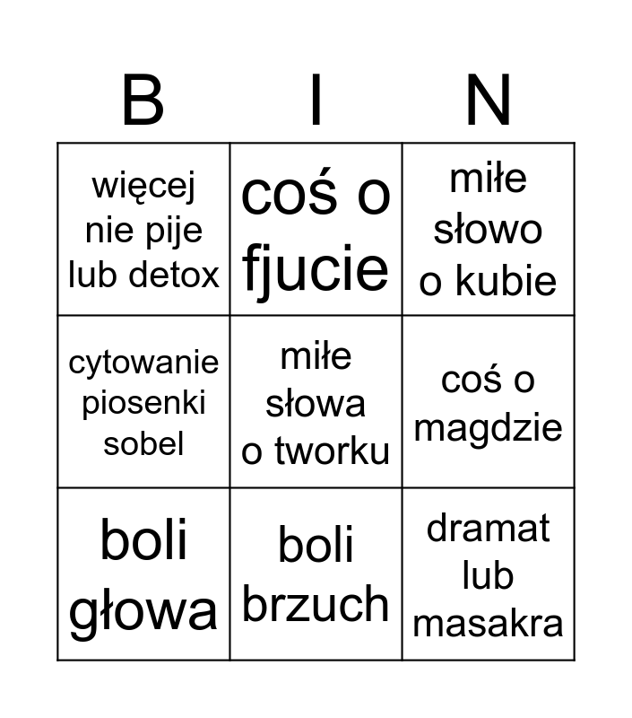 This bingo card has 9 words: boli głowa, miłe słowo o kubie, coś o fjucie, cytowanie piosenki sobel, więcej nie pije lub detox, coś o magdzie, miłe słowa o tworku, dramat lub masakra and boli brzuch.