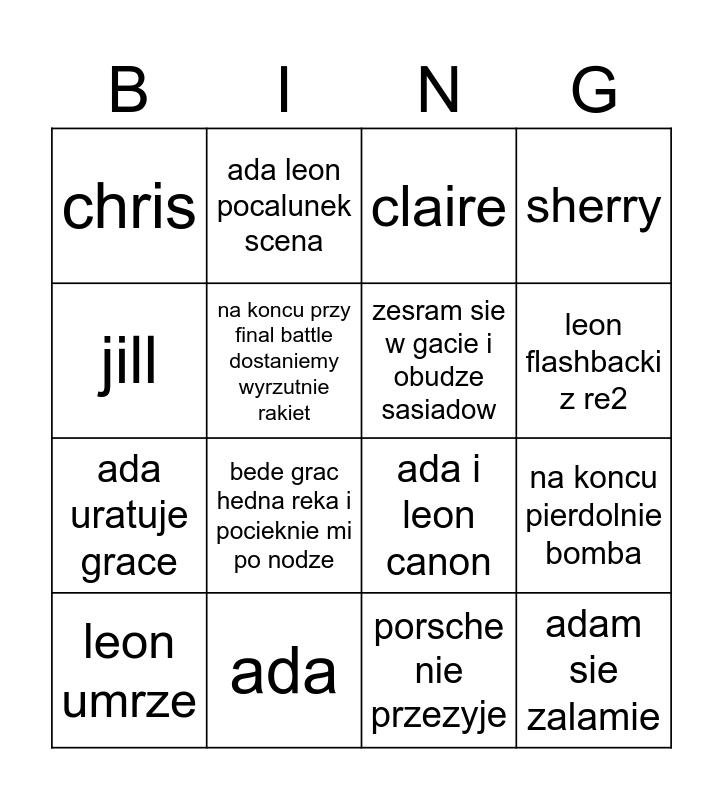 This bingo card has 16 words: leon umrze, ada, claire, sherry, jill, ada leon pocalunek scena, ada i leon canon, na koncu pierdolnie bomba, chris, na koncu przy final battle dostaniemy wyrzutnie rakiet, porsche nie przezyje, leon flashbacki z re2, ada uratuje grace, bede grac hedna reka i pocieknie mi po nodze, zesram sie w gacie i obudze sasiadow and adam sie zalamie.