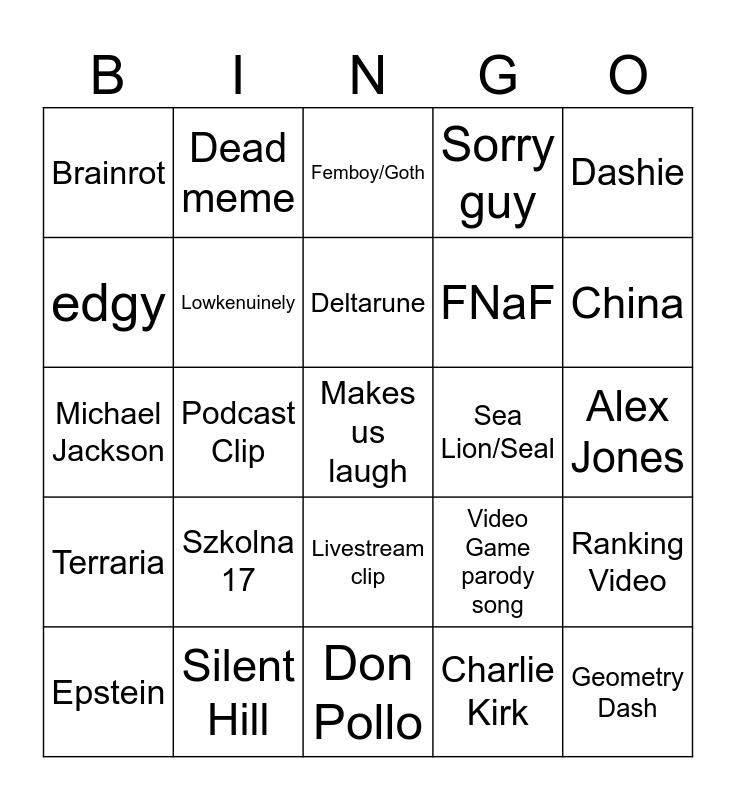This bingo card has a free space and 24 words: Szkolna 17, Silent Hill, Deltarune, Epstein, Dashie, Brainrot, edgy, Dead meme, Sea Lion/Seal, Livestream clip, FNaF, Michael Jackson, Video Game parody song, Ranking Video, Lowkenuinely, Charlie Kirk, Alex Jones, Femboy/Goth, China, Podcast Clip, Geometry Dash, Terraria, Sorry guy and Don Pollo.