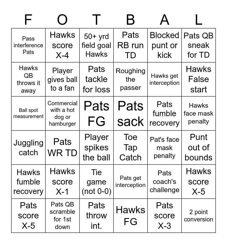 This bingo card has 97 words: Pats convert 3rd 15+, Hawks 30+ pass, Pats coach's challenge, Hawks False start, Pats 30+ pass, Hawk's coach's challenge, Pats False start, Hawks convert 3rd 15+, Pats convert 4th down, Hawks convert 4th down, Hawks score X-0, Pats score X-0, Hawks sack, Pats sack, Pass interference Hawks, Pass interference Pats, Blocked punt or kick, Fair catch inside 10, Hawks QB scramble for 1st down, Touchback, Holding on Pats, Holding on Hawks, 2 point conversion, Team stops a 4th down, Pats QB scramble for 1st down, Player gives ball to a fan, Player spikes the ball, Pats WR TD, Hawks WR TD, Pats QB throws it away, Hawks QB throws it away, Pats RB run TD, Hawks RB run TD, Player helped off the field, Pat's face mask penalty, Hawks face mask penalty, Pats throw int., Hawks throw int, Pats get interception, Hawks get interception, kicker warming up, Pats FG, Hawks FG, Punt out of bounds, Pats fumble recovery, Hawks fumble recovery, Pats fumble, Hawks fumble, Punter standing in end zone, Pat TE TD, Hawks TE TD, Hawks score X-1, Pats score X-1, Hawks score X-2, Pats score X-2, Hawks score X-3, Pats score X-3, Hawks score X-4, Pats score X-4, Hawks score X-5, Pats score X-5, Hawks score X-6, Pats score X-6, Hawks score X-7, Pats score X-7, Hawks score X-8, Pats score X-8, Hawks score X-9, Pats score X-9, Toe Tap Catch, Pats tackle for loss, Hawks tackle for loss, Team converts 3rd and goal, Hawks 20+ yrd run, Pats 20+ yrd run, Commercial with a dog, Beer commercial with celebrity, Commercial with an American flag, Commercial with a hot dog or hamburger, Tipped pass, Tie game (not 0-0), Roughing the passer, Punt or kick return for 30+ yards, Offsides on Pats, Offsides on Hawks, Helmet taken off or comes off on field, Ball spot measurement, Coach removes headset, Celebrity sighting in stands, 50+ yrd field goal Pats, 50+ yrd field goal Hawks, Holding on Pats, Holding on Hawks, Juggling catch, Pats QB sneak for TD, Hawks QB sneak for TD and Punt out of bounds.