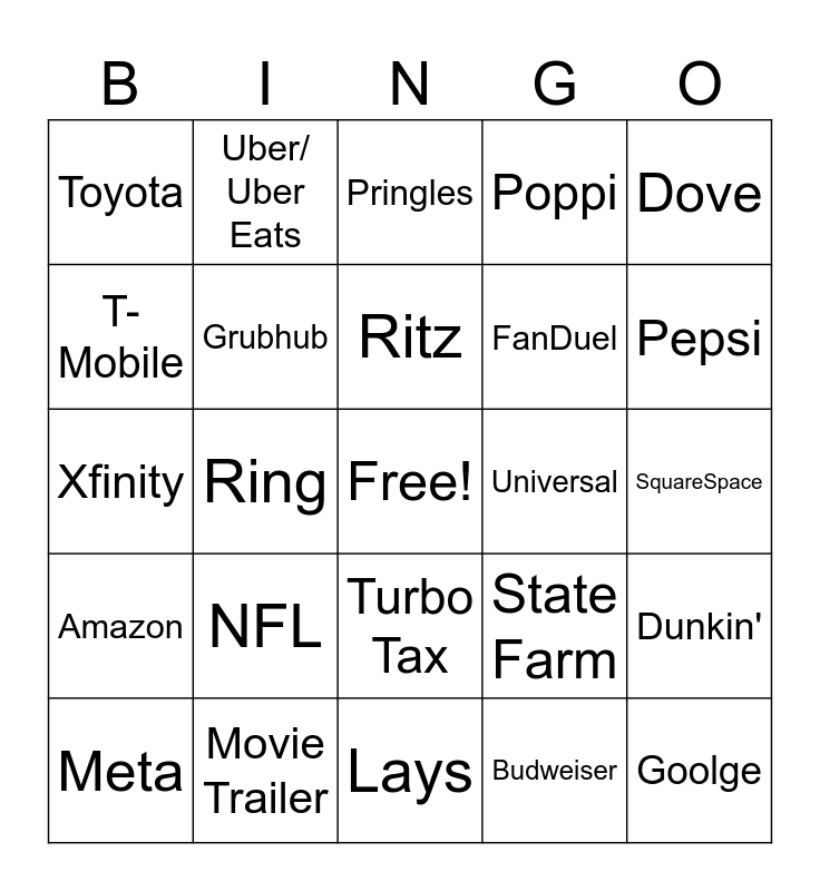 This bingo card has a free space and 24 words: NFL, Movie Trailer, Ritz, Meta, Dove, Toyota, T-Mobile, Uber/ Uber Eats, Universal, Turbo Tax, FanDuel, Xfinity, State Farm, Dunkin', Grubhub, Budweiser, SquareSpace, Pringles, Pepsi, Ring, Goolge, Amazon, Poppi and Lays.