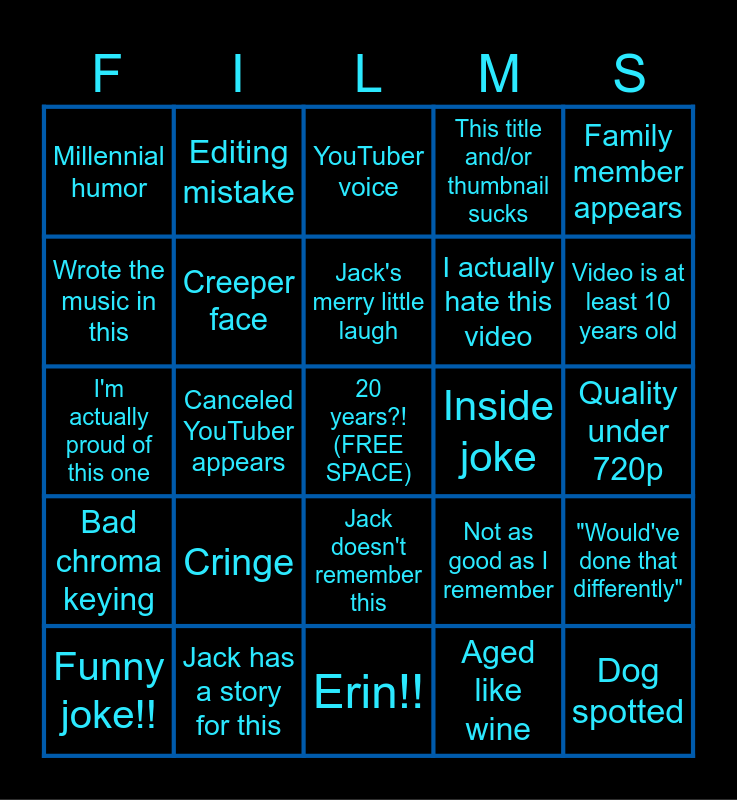 This bingo card has a free space and 29 words: Funny joke!!, Aged like milk, Canceled YouTuber appears, Old, dated reference, Millennial humor, YouTuber voice, Creeper face, Cringe, Inside joke, Jack has a story for this, Quality under 720p, Dog spotted, Erin!!, Aged like wine, Video is at least 10 years old, Retired YouTuber appears, Jack doesn't remember this, Bad chroma keying, Family member appears, I'm actually proud of this one, Not as good as I remember, Clones, I actually hate this video, Wrote the music in this, This title and/or thumbnail sucks, Editing mistake, "Would've done that differently", Jack's merry little laugh and "I still have that!".