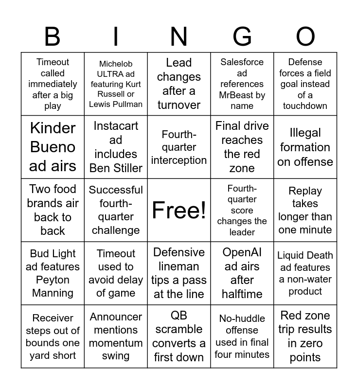 This bingo card has a free space and 48 words: Three-and-out followed immediately by a commercial break, Red zone trip results in zero points, Offensive penalty negates a big gain, QB scramble converts a first down, Timeout used to avoid delay of game, Missed tackle directly leads to first down, Michelob ULTRA ad featuring Kurt Russell or Lewis Pullman, Lay’s ad references a specific flavor, Kinder Bueno ad airs, Squarespace or Wix ad references building a website, Instacart ad includes Ben Stiller, Salesforce ad references MrBeast by name, Liquid Death ad features a non-water product, OpenAI ad airs after halftime, Two different snack brands air in the same break, Nike or Levi’s ad features no athletes, Fourth-quarter interception, Fourth-quarter score changes the leader, Game within one score at the two-minute warning, Defense forces a field goal instead of a touchdown, Successful fourth-quarter challenge, No-huddle offense used in final four minutes, Timeout called immediately after a big play, Final drive reaches the red zone, Turnover on downs in opponent territory, Illegal formation on offense, Receiver steps out of bounds one yard short, QB scrambles on third down and slides short, Defensive lineman tips a pass at the line, Bud Light ad features Peyton Manning, Lay’s ad references a specific flavor, Google ad explicitly uses the word AI, Instacart ad shows more than one celebrity, Liquid Death ad uses on-screen slogan text, Announcer mentions momentum swing, Coach argues briefly with an official, Timeout used to avoid delay of game, Replay takes longer than one minute, Fourth-quarter field goal attempt, Fourth-quarter sack on second down, Clock stops under thirty seconds due to out of bounds, Drive reaches red zone and results in field goal, Lead changes after a turnover, Camera shows crowd reaction before replay, Two food brands air back to back, Apple Music bumper appears twice, Winning score occurs under two minutes and Game ends on defensive stop.