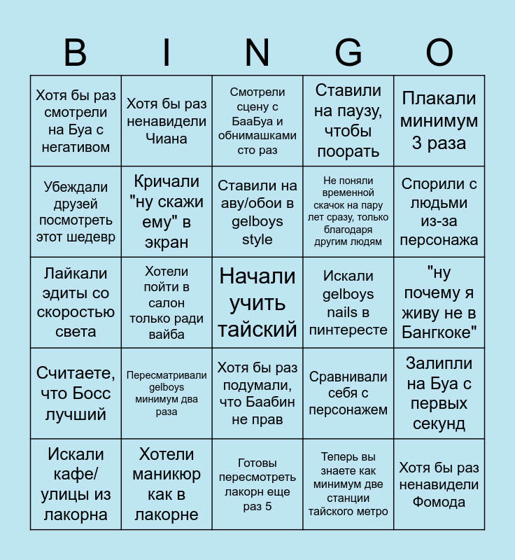 This bingo card has a free space and 24 words: Пересматривали gelboys минимум два раза, Хотели маникюр как в лакорне, Ставили на аву/обои в gelboys style, Искали кафе/улицы из лакорна, Плакали минимум 3 раза, Хотя бы раз смотрели на Буа с негативом, Убеждали друзей посмотреть этот шедевр, Хотя бы раз ненавидели Чиана, Искали gelboys nails в пинтересте, Хотя бы раз подумали, что Баабин не прав, Не поняли временной скачок на пару лет сразу, только благодаря другим людям, Лайкали эдиты со скоростью света, Сравнивали себя с персонажем, Залипли на Буа с первых секунд, Кричали "ну скажи ему" в экран, Теперь вы знаете как минимум две станции тайского метро, "ну почему я живу не в Бангкоке", Смотрели сцену с БааБуа и обнимашками сто раз, Спорили с людьми из-за персонажа, Хотели пойти в салон только ради вайба, Хотя бы раз ненавидели Фомода, Считаете, что Босс лучший, Ставили на паузу, чтобы поорать and Готовы пересмотреть лакорн еще раз 5.