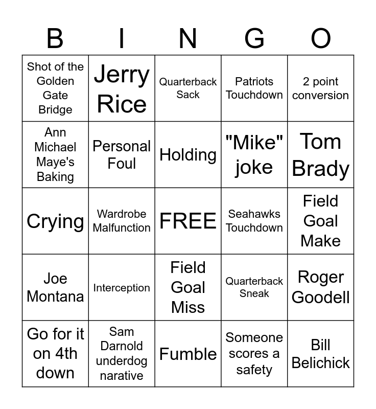 This bingo card has a free space and 24 words: Interception, Sam Darnold underdog narative, Holding, Go for it on 4th down, 2 point conversion, Shot of the Golden Gate Bridge, Ann Michael Maye's Baking, Jerry Rice, Seahawks Touchdown, Field Goal Miss, "Mike" joke, Crying, Quarterback Sneak, Roger Goodell, Personal Foul, Someone scores a safety, Field Goal Make, Quarterback Sack, Tom Brady, Wardrobe Malfunction, Bill Belichick, Joe Montana, Patriots Touchdown and Fumble.