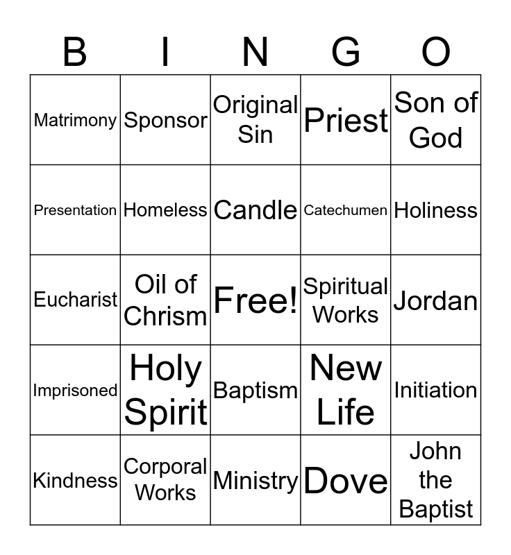 This bingo card has a free space and 42 words: White Garment, Candle, Sacrament, Holy Spirit, Dove, Initiation, John the Baptist, Holy Water, Original Sin, Baptism, Jordan, Holiness, Oil of Chrism, Son of God, Salvation, New Life, Trinity, Eucharist, Godparent, Sponsor, Presentation, Confirmation, Service, Matrimony, Peace, Grace, Catechumen, Poor, Hungry, Vocation, Disciple, Imprisoned, Homeless, Ministry, Missionary, Kindness, Corporal Works, Spiritual Works, Compassion, Merciful, Priest and Family.