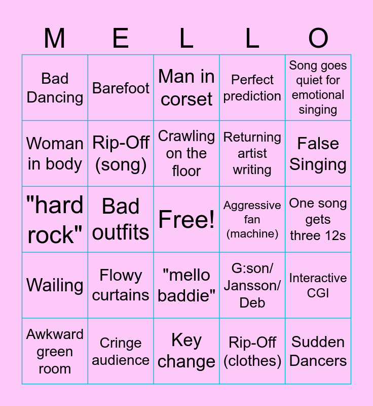 This bingo card has a free space and 27 words: G:son/ Jansson/ Deb, Choir, Returning artist writing, Key change, Woman in body, Man in corset, Barefoot, Wailing, Aggressive fan (machine), Interactive CGI, "hard rock", Perfect prediction, Awkward green room, Cringe audience, False Singing, Influencer "artist", Rip-Off (song), Crawling on the floor, Flowy curtains, Bad Dancing, One song gets three 12s, Rip-Off (clothes), Bad outfits, Sudden Dancers, "mello baddie", Song goes quiet for emotional singing and Epilepsy Lights.