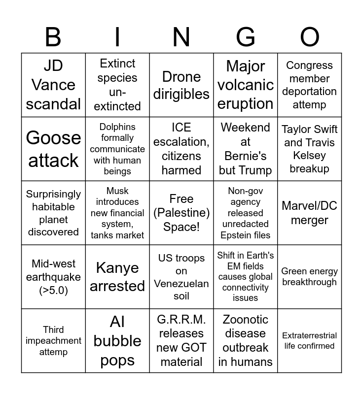 This bingo card has a free space and 24 words: Kanye arrested, AI bubble pops, ICE escalation, citizens harmed, Third impeachment attemp, Congress member deportation attemp, JD Vance scandal, Goose attack, Extinct species un-extincted, Non-gov agency released unredacted Epstein files, US troops on Venezuelan soil, Weekend at Bernie's but Trump, Surprisingly habitable planet discovered, Shift in Earth's EM fields causes global connectivity issues, Green energy breakthrough, Dolphins formally communicate with human beings, Zoonotic disease outbreak in humans, Marvel/DC merger, Drone dirigibles, Taylor Swift and Travis Kelsey breakup, Musk introduces new financial system, tanks market, Extraterrestrial life confirmed, Mid-west earthquake (>5.0), Major volcanic eruption and G.R.R.M. releases new GOT material.