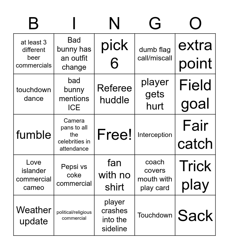 This bingo card has a free space and 27 words: coach covers mouth with play card, coach yells at the refs, player gets hurt, player crashes into the sideline, touchdown dance, pick 6, Bad bunny has an outfit change, Love islander commercial cameo, Interception, Trick play, fumble, dumb flag call/miscall, Weather update, political/religious commercial, Field goal, missed FG, bad bunny mentions ICE, Referee huddle, Pepsi vs coke commercial, at least 3 different beer commercials, Fair catch, Touchdown, Camera pans to all the celebrities in attendance, Sack, fan with no shirt, extra point and facemask.
