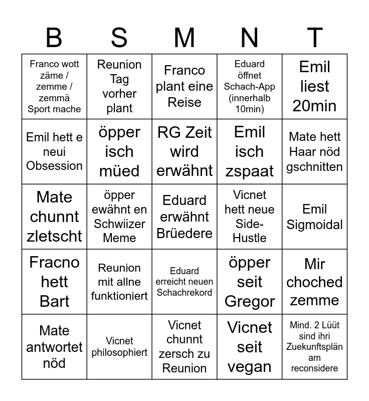 This bingo card has a free space and 24 words: Reunion mit allne funktioniert, Vicnet philosophiert, RG Zeit wird erwähnt, Mate antwortet nöd, Emil liest 20min, Franco wott zäme / zemme / zemmä Sport mache, Emil hett e neui Obsession, Reunion Tag vorher plant, Vicnet hett neue Side-Hustle, Eduard erreicht neuen Schachrekord, Emil isch zspaat, Mate chunnt zletscht, öpper seit Gregor, Mir choched zemme, öpper isch müed, Vicnet seit vegan, Emil Sigmoidal, Franco plant eine Reise, Mate hett Haar nöd gschnitten, öpper ewähnt en Schwiizer Meme, Mind. 2 Lüüt sind ihri Zuekunftsplän am reconsidere, Fracno hett Bart, Eduard öffnet Schach-App (innerhalb 10min) and Vicnet chunnt zersch zu Reunion.