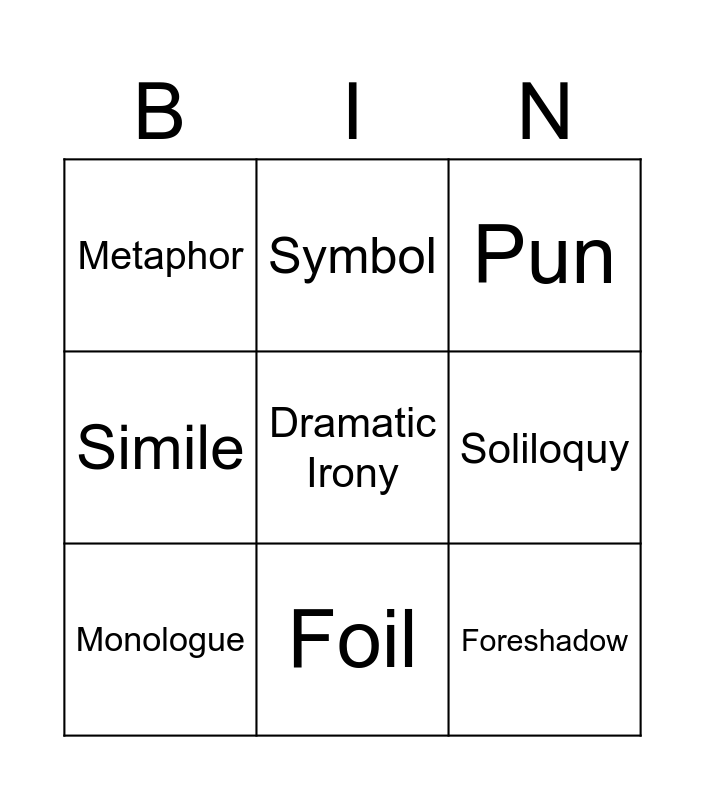 This bingo card has 9 words: Monologue, Pun, Symbol, Simile, Metaphor, Soliloquy, Dramatic Irony, Foreshadow and Foil.