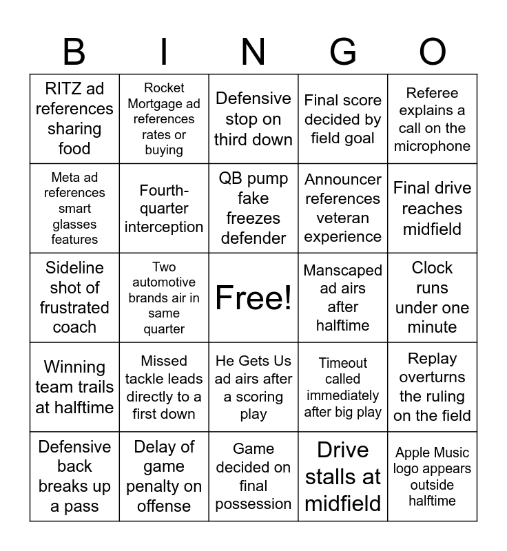 This bingo card has a free space and 24 words: Missed tackle leads directly to a first down, Delay of game penalty on offense, QB pump fake freezes defender, Defensive back breaks up a pass, Referee explains a call on the microphone, RITZ ad references sharing food, Meta ad references smart glasses features, Rocket Mortgage ad references rates or buying, Manscaped ad airs after halftime, He Gets Us ad airs after a scoring play, Announcer references veteran experience, Sideline shot of frustrated coach, Timeout called immediately after big play, Replay overturns the ruling on the field, Fourth-quarter interception, Drive stalls at midfield, Clock runs under one minute, Defensive stop on third down, Final drive reaches midfield, Two automotive brands air in same quarter, Apple Music logo appears outside halftime, Winning team trails at halftime, Final score decided by field goal and Game decided on final possession.