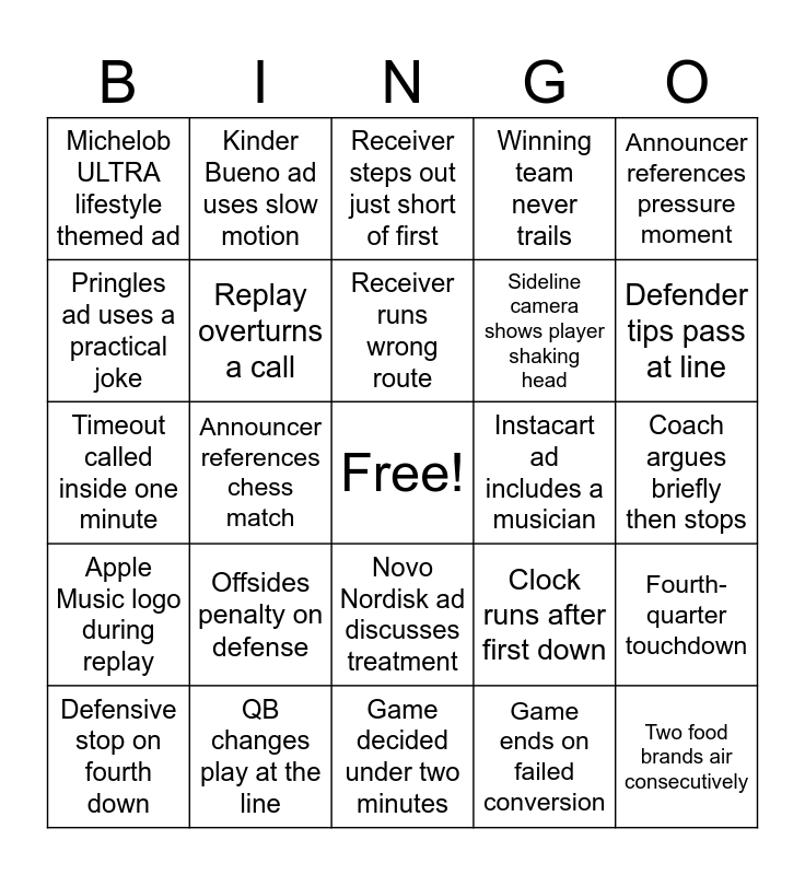 This bingo card has a free space and 24 words: Offsides penalty on defense, QB changes play at the line, Receiver runs wrong route, Defensive stop on fourth down, Announcer references pressure moment, Michelob ULTRA lifestyle themed ad, Pringles ad uses a practical joke, Kinder Bueno ad uses slow motion, Instacart ad includes a musician, Novo Nordisk ad discusses treatment, Sideline camera shows player shaking head, Timeout called inside one minute, Clock runs after first down, Fourth-quarter touchdown, Replay overturns a call, Game ends on failed conversion, Coach argues briefly then stops, Receiver steps out just short of first, Defender tips pass at line, Announcer references chess match, Two food brands air consecutively, Apple Music logo during replay, Winning team never trails and Game decided under two minutes.