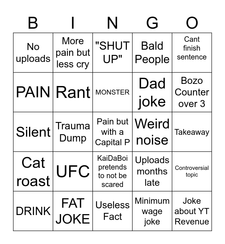 This bingo card has a free space and 24 words: UFC, FAT JOKE, MONSTER, DRINK, Cant finish sentence, No uploads, PAIN, More pain but less cry, Weird noise, KaiDaBoi pretends to not be scared, Dad joke, Silent, Uploads months late, Controversial topic, Rant, Minimum wage joke, Takeaway, "SHUT UP", Bozo Counter over 3, Trauma Dump, Joke about YT Revenue, Cat roast, Bald People and Useless Fact.
