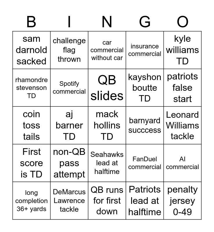 This bingo card has 82 words: talking animal, horse in beer commercial, car commercial without car, fireworks or pyrotechnics, false start penalty, sunglasses, JSN touchdown, K9 touchdown, two point conversion attempt, fourth down conversion made, fourth down conversion failed, sam darnold interception, Spotify commercial, barnyard succcess, barnyard failure, sam darnold sacked, long completion 36+ yards, rhamondre stevenson TD, treveyon henderson TD, george holani 3+yd run, stefon diggs TD, kayshon boutte TD, mack hollins TD, kyle williams TD, aj barner TD, rashid shaheed TD, hunter henry TD, drake maye sacked, drake maye interception, Kupp touchdown, non-QB pass attempt, coin toss heads, coin toss tails, penalty jersey 0-49, penalty jersey 50-99, QB runs for first down, movie trailer, seahawks false start, patriots false start, seahawks first down, patriots first down, insurance commercial, player helps opponent stand up, pass interference penalty, missed kick, challenge flag thrown, Super Bowl 49 mentioned, QB slides, kick hits uprights, gatorade shown, Ernest Jones tackle, Leonard Williams tackle, DeMarcus Lawrence tackle, Nick Emmanwori tackle, Patriots blitz, Seahawks blitz, Seahawks mascot shown, Patriots mascot shown, Player scores 2 TDs, FanDuel commercial, Paramount+ mentioned, Measurement for first down, First score is TD, First score is FG, Darnold shown during anthem, Maye shown during anthem, 3+ timeouts in first half, Wireless carrier commercial, Kicker makes 3+ FGs, non-QB throws a pass, Seahawks lead after 1st quarter, Patriots lead after 1st quarter, Seahawks lead at halftime, Patriots lead at halftime, Disney+ commercial, Halftime show mentions ICE, 50+ yard field goal attempt, injured player goes into tent, safety, intentional grounding penalty, AI commercial and taunting penalty.